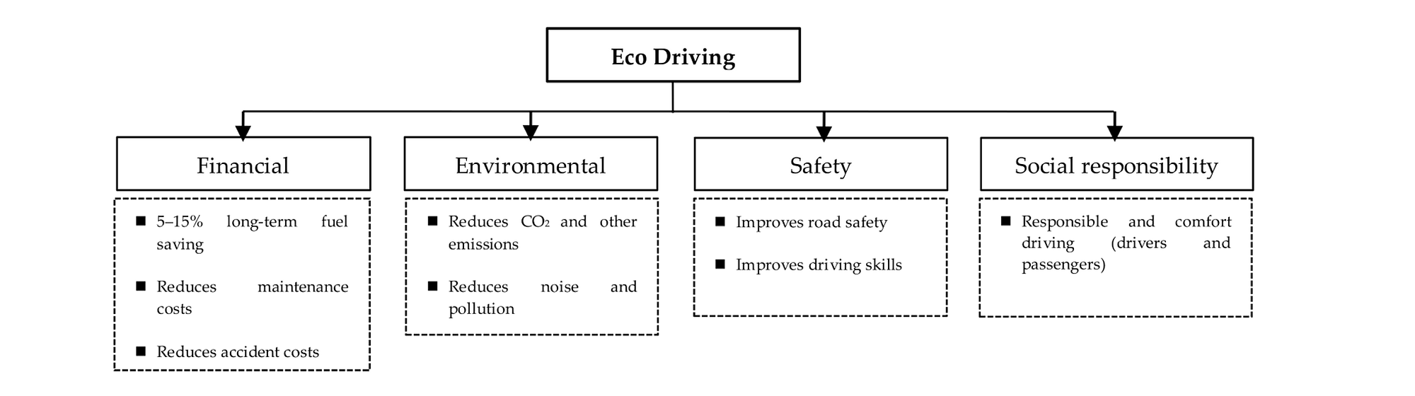 The concept of eco-driving includes four aspects. The figure below provides an overview of the concept and how it can influence each aspect.